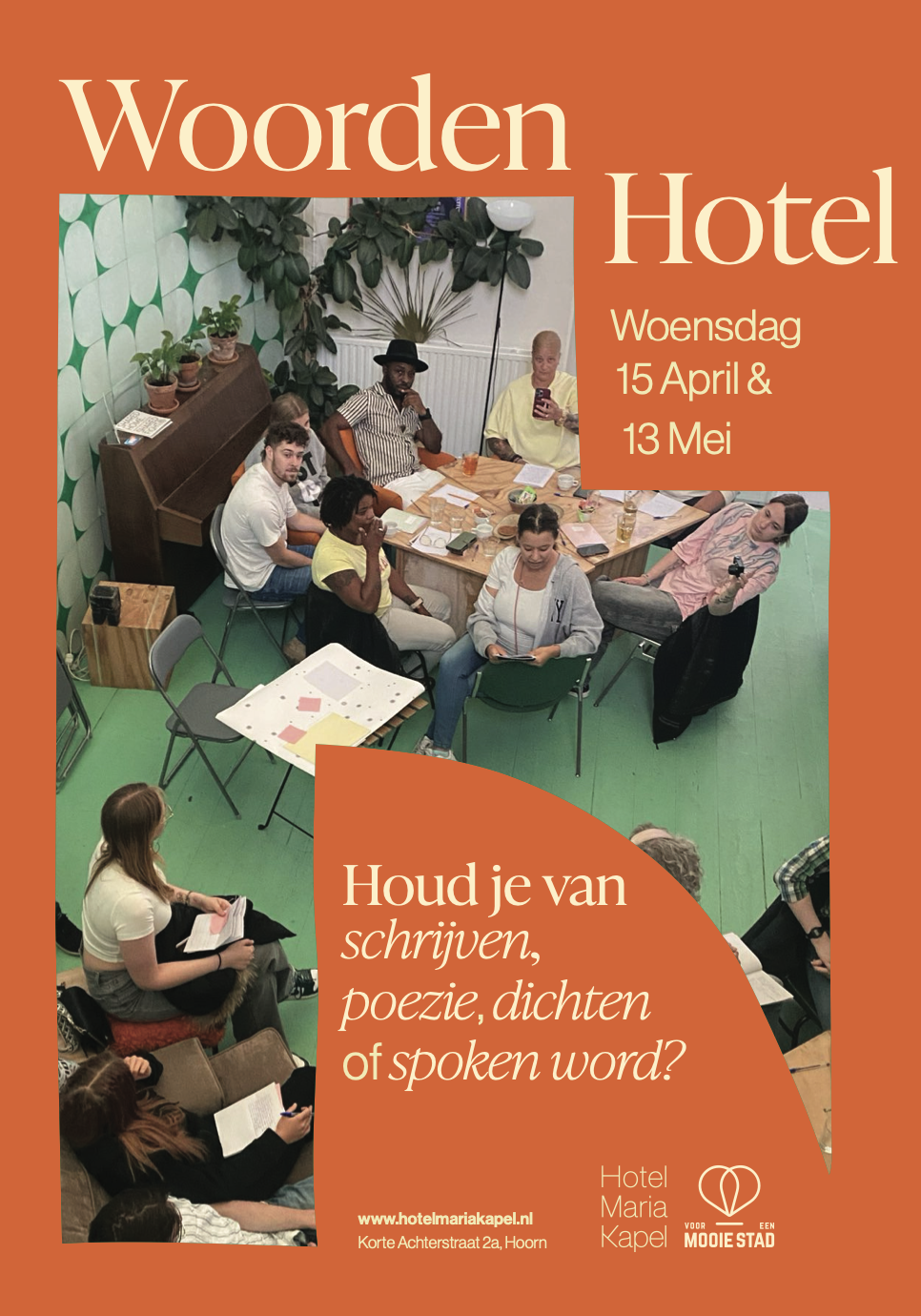 Woorden Hotel wants to inspire the city of Hoorn with a poem originating from these sessions, which will presented on the facade of Hotel Maria Kapel. After each session the poem will be selected. This way, the young writers and practitioners of poetry in Hoorn are offered the change to be exposed in the city for as long as a season .